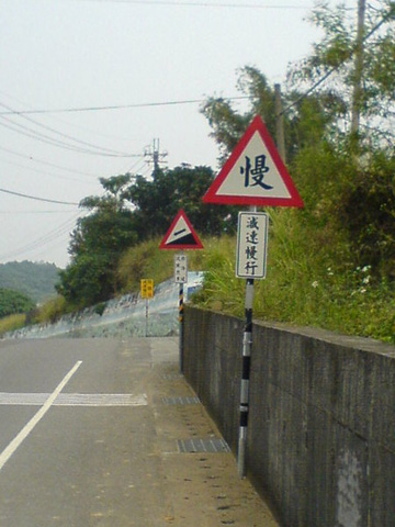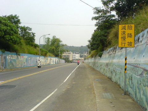 沒多久就到了這段山路裡面最陡的險降坡了,一連三個警告標誌,現在滑下去是很愜意,但是回程時要爬上來就要抖了。附帶一提,其實這裡兩旁都是夜總會....。