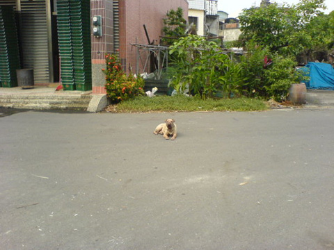路上有一隻臉很搞笑的狗趴在路中央休息。