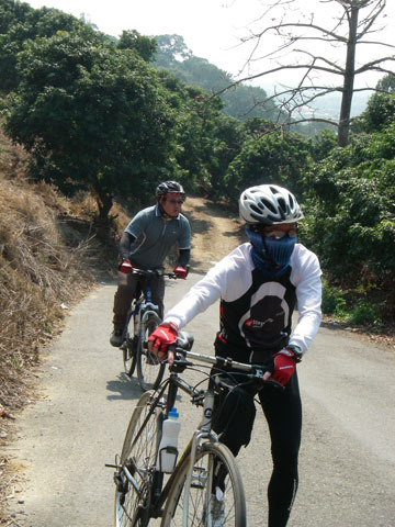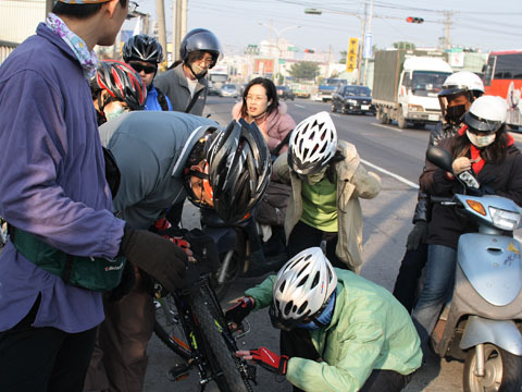 一開始沒多久,新夥伴筱晴向big brother鄭借的車就出了異音,鄭大哥大概最近心老向著他的超老爺古董鋼管不太公路的公路車(我實在很難承認他是road bike...哈哈),MTB在抗議備受冷落了。