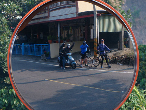 中途等鄭大哥回去修車的時候,看到單身騎士的最愛─ ─反光鏡,趕快來一張。機車士竟然在後面湊熱鬧。