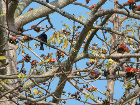 還好路旁有我滿喜歡的木棉,要不然會扛到瘋掉。這隻鳥不知道是不是小卷尾,縮成一團有點難認,我的鳥功大概也都還給社上了。